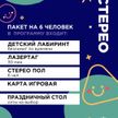 Пакет на 6 чел. В программу входит: детский лабиринт (безлимит по времени) • лазертаг (30 мин.) • стерео-пол (6 чел.) • карта игровая (номинал 50 BYN) • праздничный стол (сеты на выбор)